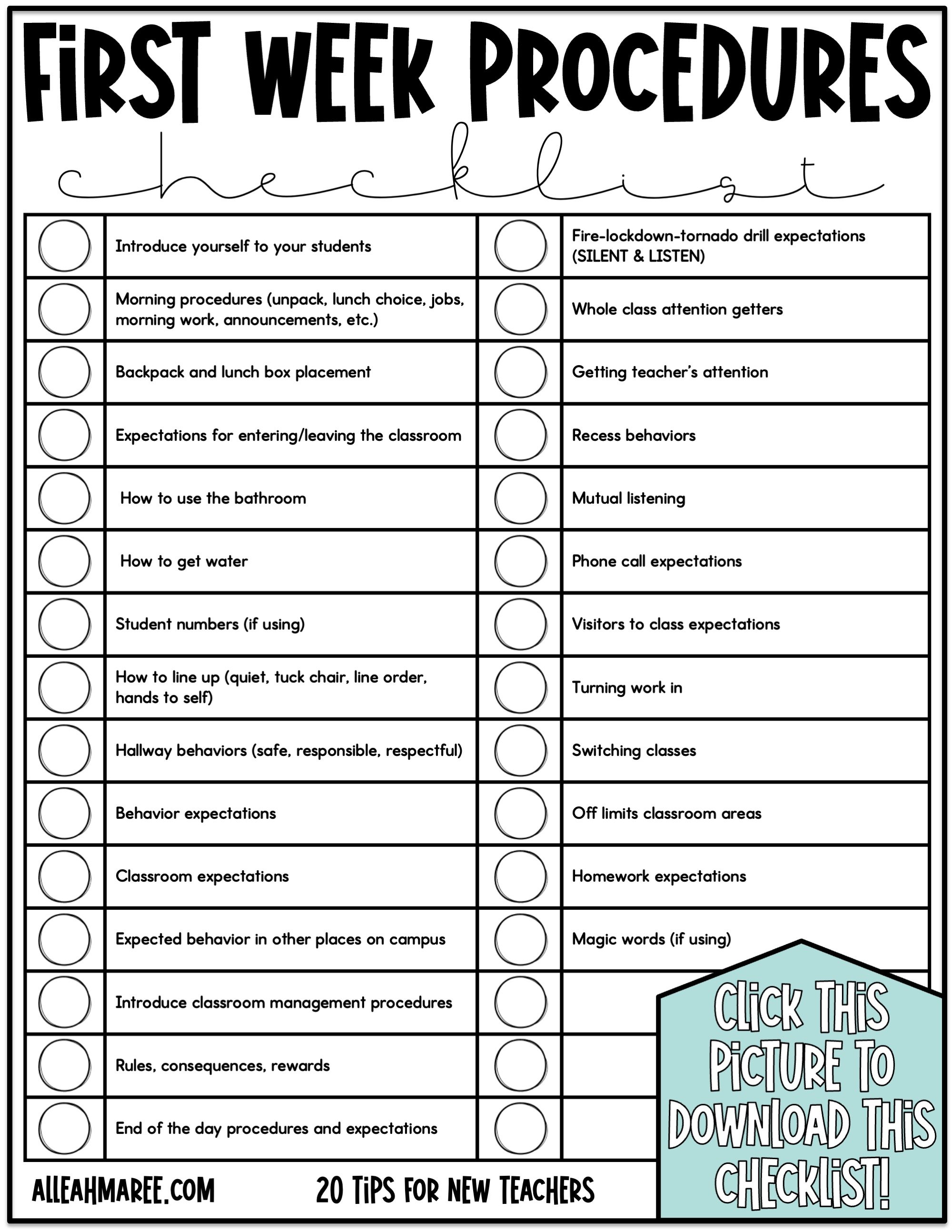 Making a list of all the procedures want to cover with your students when they come in the first day (and week!) is a great way to make sure you explain all the procedural information your students will need.